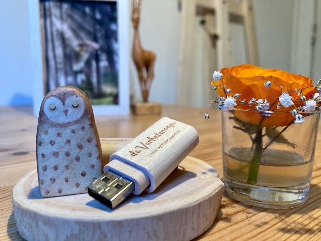 je ontvangt een uniek gepersonaliseerd luisterverhaal op maat, gebrand op een duurzame (FSC-gecertificeerde) houten usb-stick