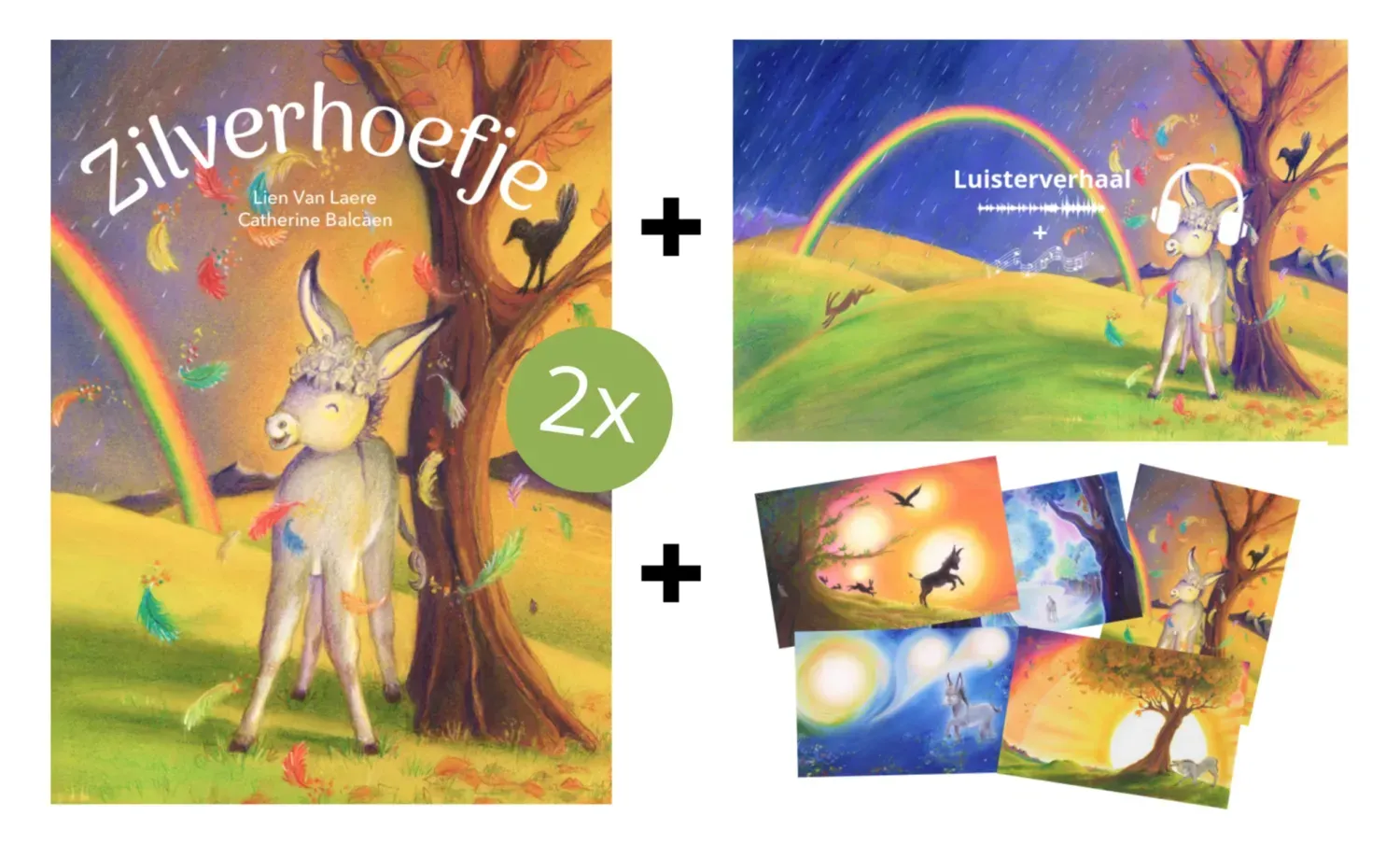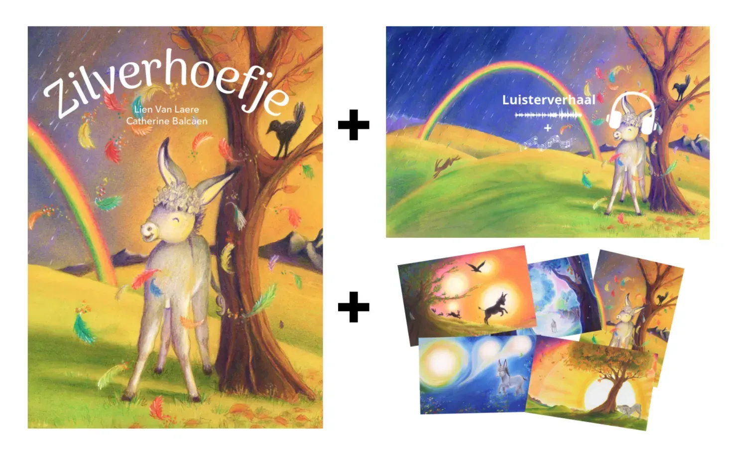 Boek 'Zilverhoefje' met harde kaft en 48 bladzijden. Verhaal op rijm, paginagrote illustraties. Lokaal en milieuvriendelijk gedrukt met plantaardige inkten op kwalitatief 100% gerecycleerd papier.