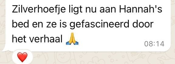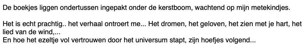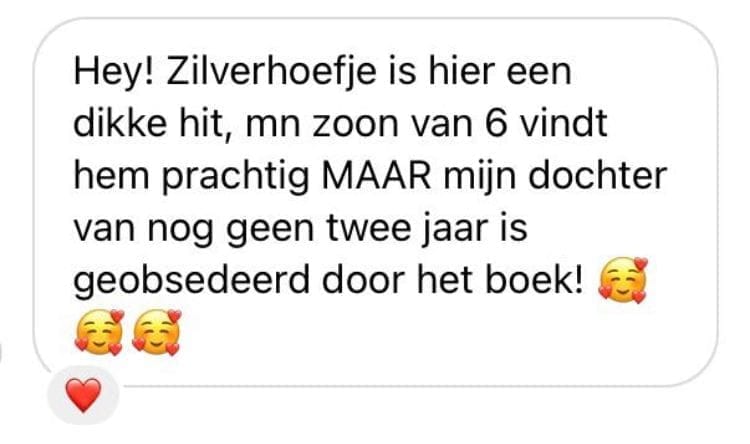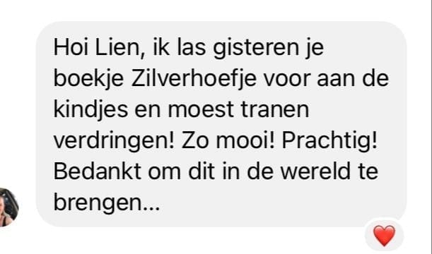 “Vandaag bracht de postbode jouw prachtige Zilverhoefje. Het is een lichtgevende parel en ik popel om het mijn kleinzoon voor te lezen. Ik wacht nog tot Kerstmis, het feest van het licht, dat velen samen met Zilverhoefje zullen vieren. Bedankt!"